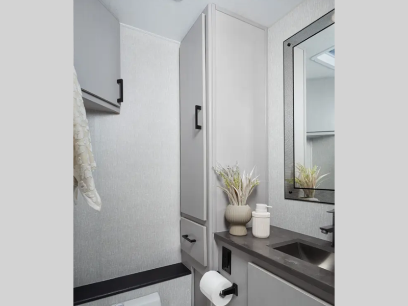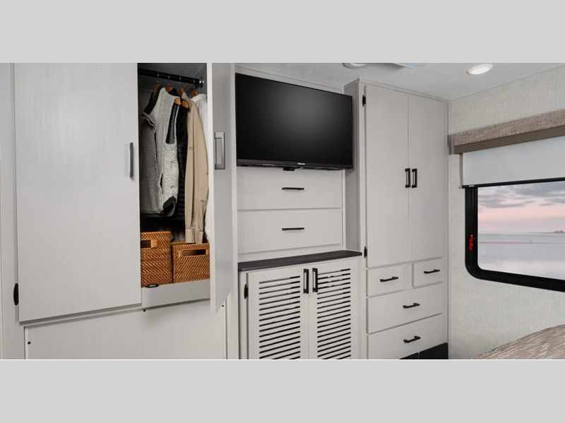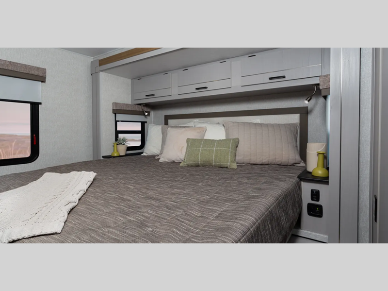 Some of the top features you will enjoy are the CRV SuperSprings Ride, the large cab-over area with cup holders, storage, and USB ports, plus dual 15,000 BTU A/C units for maximum comfort. Comfortable seating and sleeping spaces come standard, along with full bath and kitchen amenities, plus plenty of storage space for your belongings. The mandatory ICON Package includes a power inclining king bed, a convenient tankless water heater, 50 amp service, and more features to make your time on the road easier than ever.