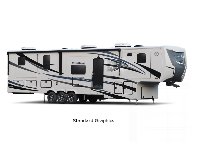 The Forest River RiverStone fifth wheels and toy haulers are super luxurious and convenient for all your camping or full-time needs! These elegant units have standard features that will enhance every aspect of your trip, like a cordless vacuum, 18-cubic foot French door refrigerator with an ice maker, an under-bed storage compartment, and hydraulic slide outs.