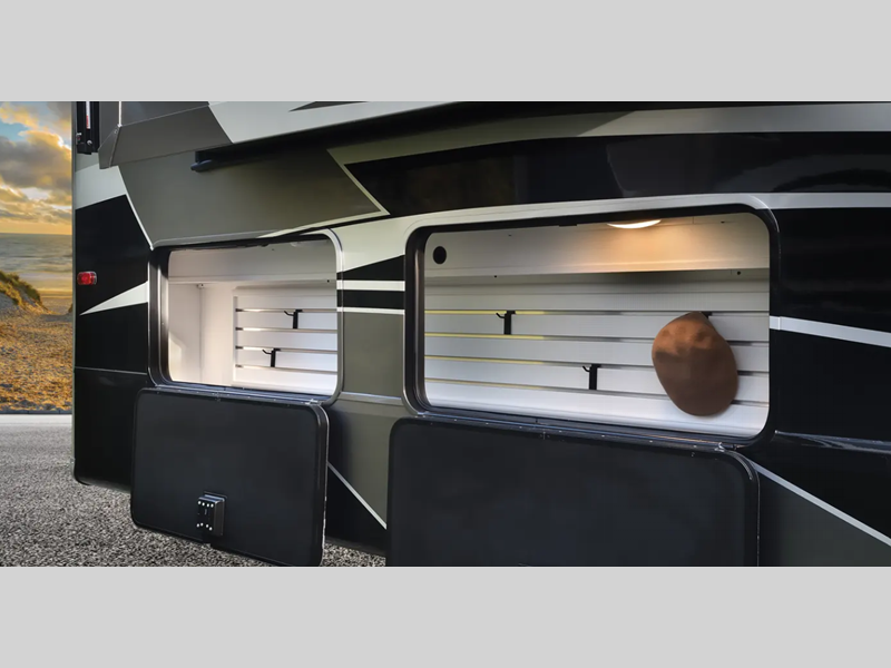 Sleeps 4 Slides 5 Length 44 ft 7 in Ext Width 8 ft 6 in Ext Height 13 ft 4 in Hitch Weight 3950 lbs GVWR 24000 lbs Dry Weight 17726 lbs Cargo Capacity 6274 lbs Fresh Water Capacity 95 gals Grey Water Capacity 82 gals Black Water Capacity 41 gals Tire Size 17.5" Furnace BTU 40000 btu Available Beds Super Queen Refrigerator Type French Door with Ice Maker Refrigerator Size 18 cu ft Convection Cooking Yes Cooktop Burners 4 Number of Awnings 2 Axle Weight 7000 lbs LP Tank Capacity 40 lbs Water Heater Type Truma Aqua Go Comfort On Demand AC BTU 30000 btu TV Info LR 65" Samsung LED Smart TV, BR 40" Smart LED TV, Ext. TV Awning Info 11' 6" and 18' Electric with LED Lights Axle Count 3 Washer/Dryer Available Yes Number of LP Tanks 2 Shower Type Standard Electrical Service 50 amp Similar Floorplans