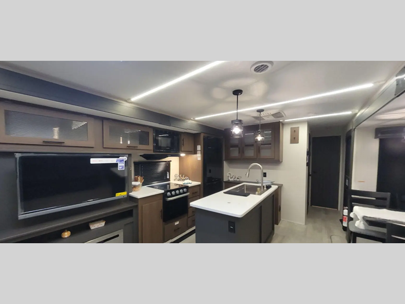 Sleeps 5 Slides 2 Length 33 ft 11 in Ext Width 8 ft Ext Height 11 ft 9 in Hitch Weight 945 lbs GVWR 11145 lbs Dry Weight 7916 lbs Cargo Capacity 3229 lbs Fresh Water Capacity 61 gals Grey Water Capacity 96 gals Black Water Capacity 32 gals Available Beds Maxx King Refrigerator Type 12V Refrigerator Size 10 cu ft Cooktop Burners 3 Shower Size 36" x 30" Number of Awnings 1 Water Heater Type On Demand Tankless TV Info 12V 2-Zone Smart TV Axle Count 2 Shower Type Standard Similar Floorplans